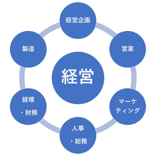 当事務所では、中小企業診断士が、経営企画、コマーシャル(営業・マーケティング)、製造、管理(財務・経理・人事総務)といった機能毎の支援ばかりでなく、貴社の経営を俯瞰的な視点から捉え、機能間の連動等、組織全体最適の観点から包括的なアドバイス・支援が可能です。もちろん、機能毎の課題に関するご相談も承っています。