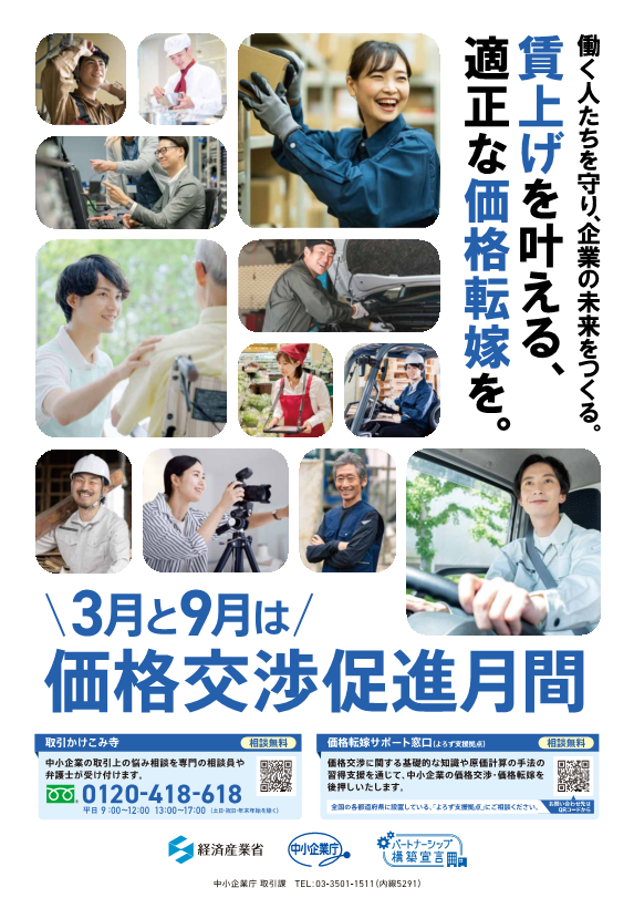政府では、毎年9月と3月を「価格交渉促進月間」と位置付け、中小企業の価格転嫁・取引適正化に向けた取組を進めています。