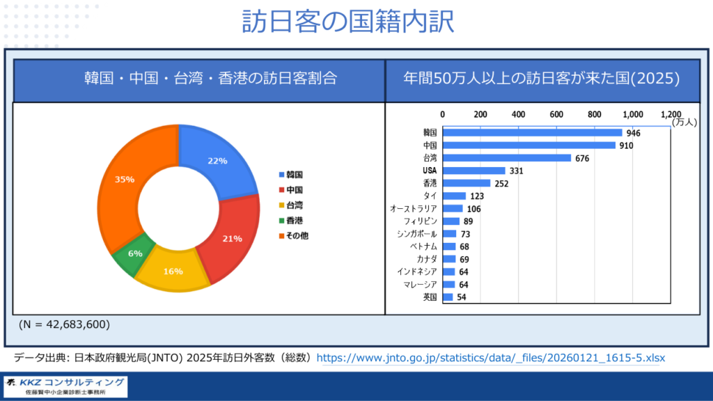 2025年の訪日客の国籍別内訳を見ると、韓国・中国・台湾・香港のいわゆる東アジア近隣国が全体の65%、約2/3を占めることが分かります。