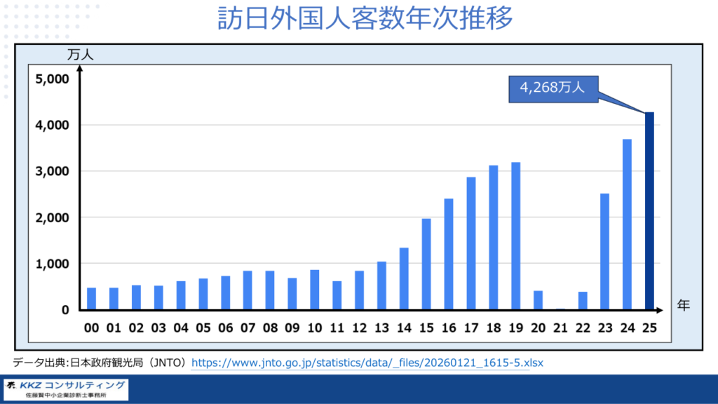 2026年1月20日、国土交通省は訪日外国人客数が約4,270万人に上る見通しであると発表しています。
